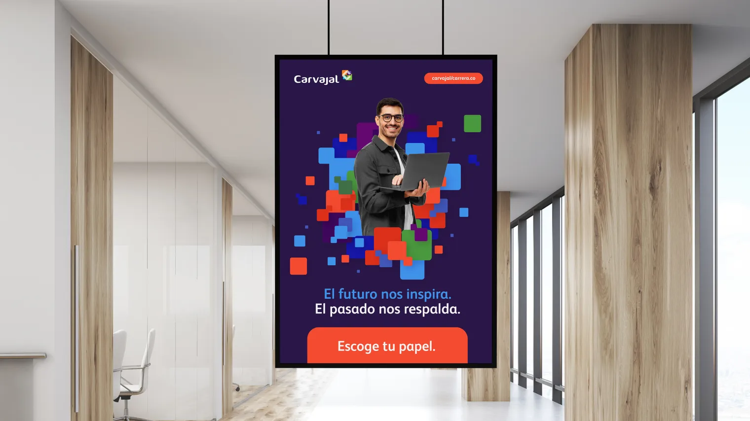 La forma atractiva y distintiva de promover la propuesta de valor hacia el talento se planteó alrededor de un concepto sombrilla auténtico y creativo. El mensaje "El futuro nos inspira. El pasado nos respalda. El presente eres tú.” ayuda a posicionar las marcas como empleador, comunicando mútiples razones para que el talento trabaje en Carvajal. Los protagonistas del concepto son los mismos colaboradores, que a través de sus experiencias y testimonios confirman la oferta de la compañía.